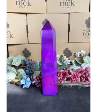 Note: The tower itself is a natural quartz that has been dyed and aura (titanium) coated