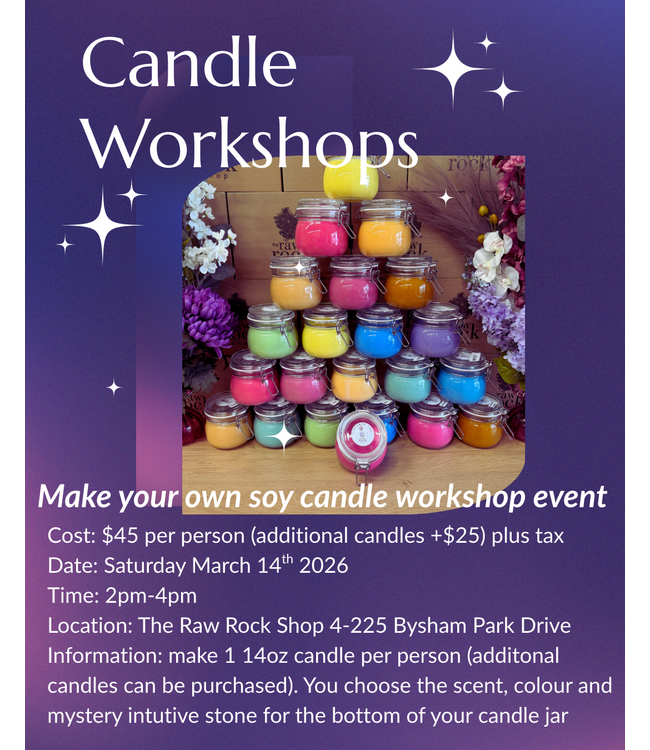 Information: make 1 14oz candle per person (additonal candles can be purchased). You choose the scent, colour and mystery intutive stone for the bottom of your candle jar