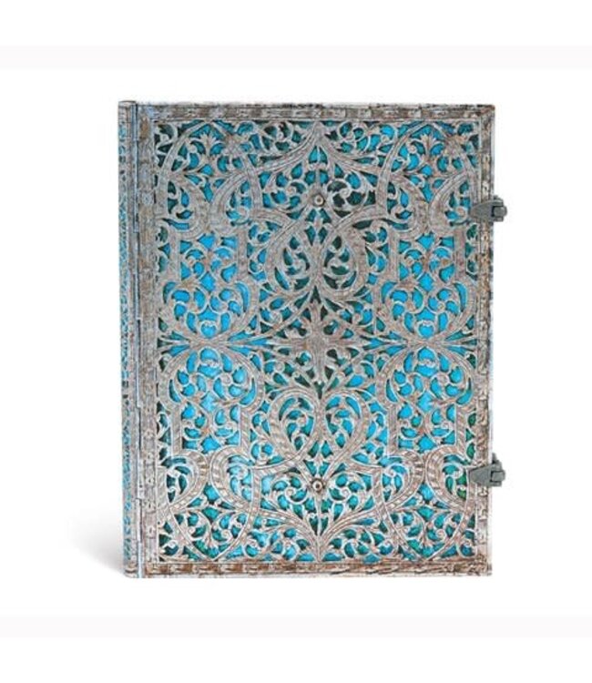Combining the Latin words "filum" (thread) and "granum" (seed), silver "filigree" describes an art form that is achieved by first die cutting a base layer of silver sheets and then meticulously etching elaborate grooves into its surface. The polished binding seen on Paperblanks Silver Filigree Maya Blue journal is inspired by a 1697 French binding of Johann Arndt's Paradiesgärtlein.