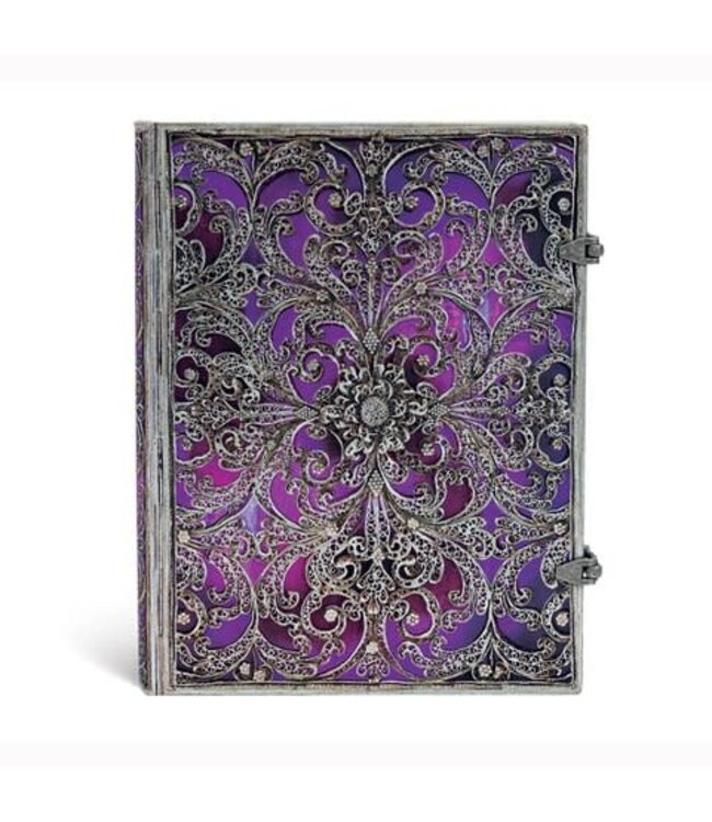 This Paperblanks Silver Filigree Aubergine journal cover was originally designed in Germany in the early 1800s. To achieve the gilded motif, a base layer of silver sheets was first die cut, and elaborate grooves were then etched into its surface. Our silver and deep purple notebook celebrates the technique of filigree, an art form that is a testament to the human drive to ornament.