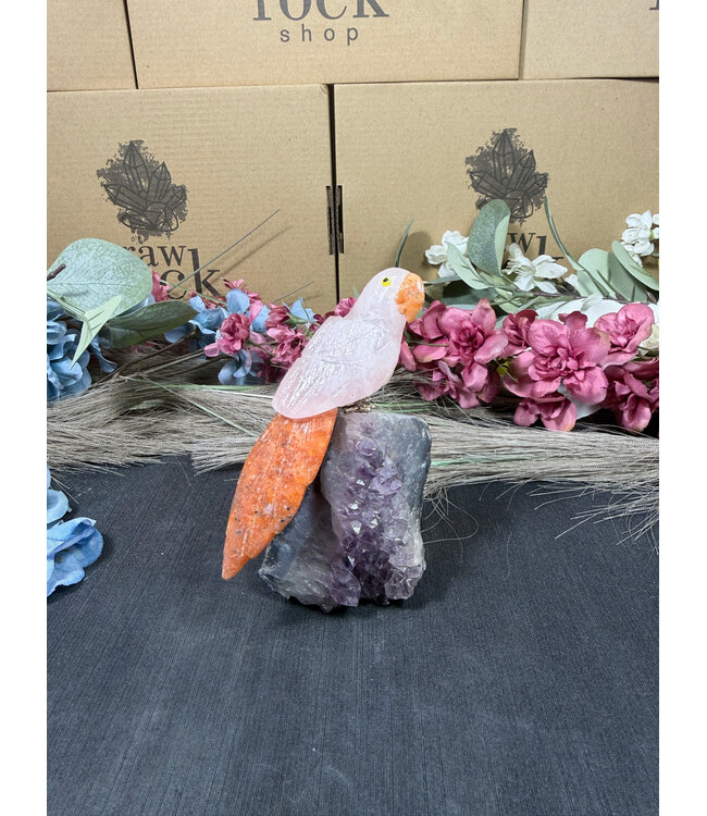 Natural Gemstone Parrot Carving on Crystal Base