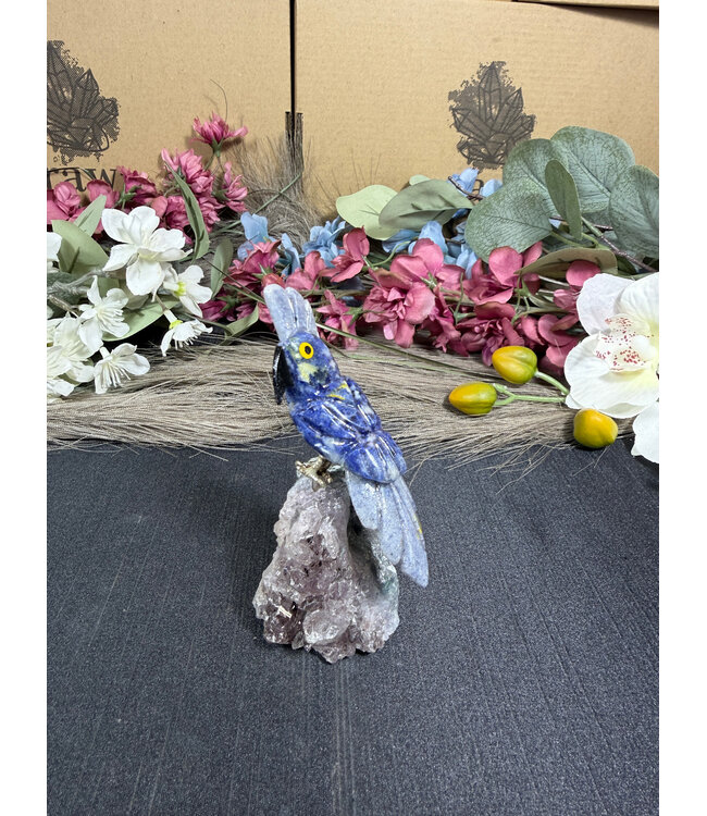 Natural Gemstone Parrot Carving on Crystal Base