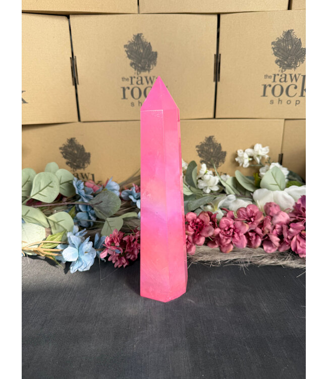 Note: The tower itself is a natural quartz that has been dyed and aura (titanium) coated